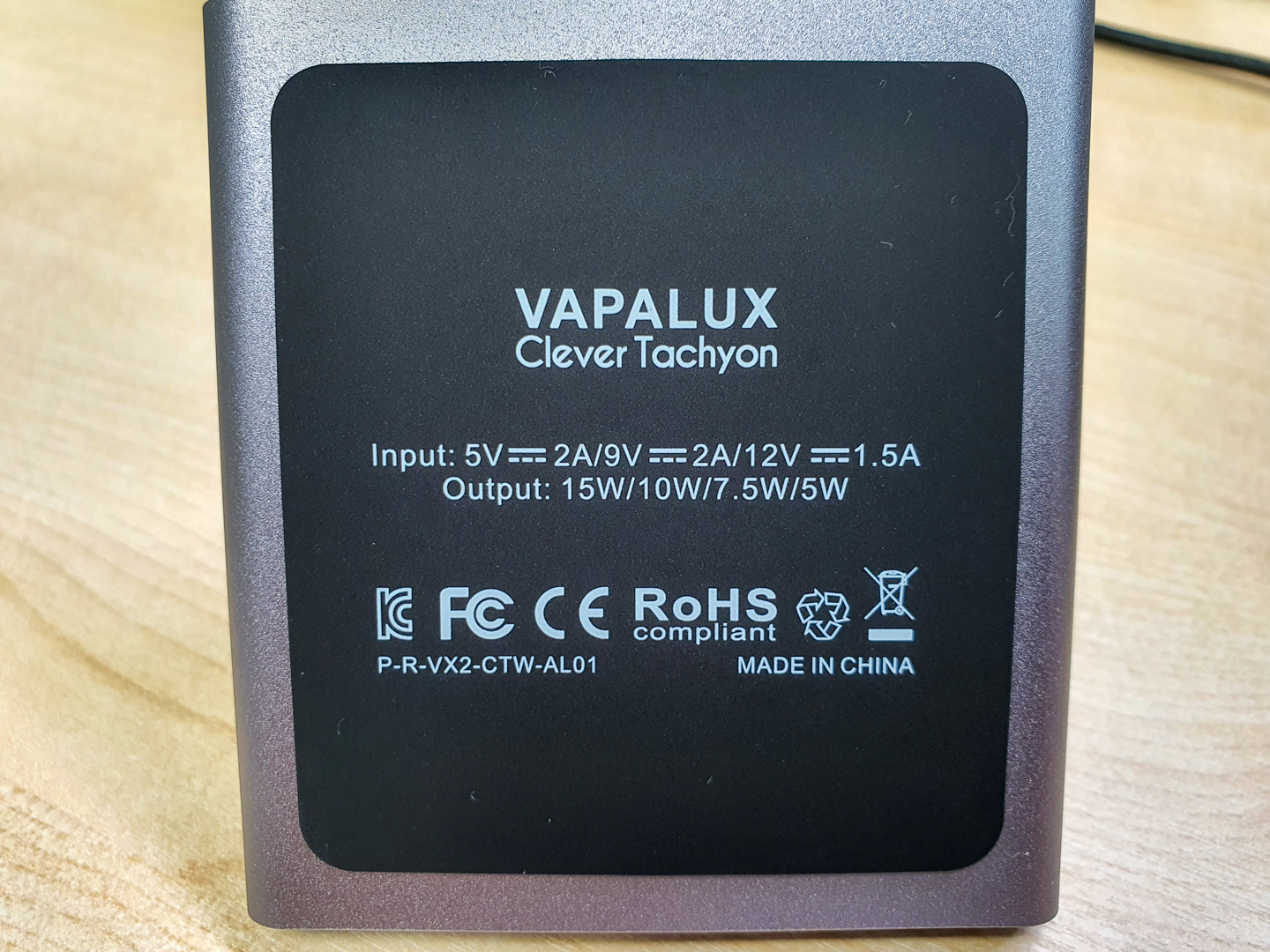 제품 아랫면에는 정격 입력과 정격 출력 부분, 그리고 각종 인증이 표기되어 있습니다. 출력은 5W, 7.5W, 10W, 15W를 지원합니다.