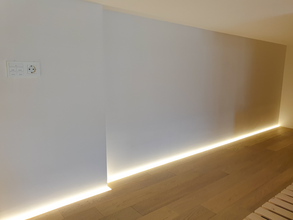 복층으로 이어지는 계단과 침대 바로 옆 벽면에 이렇게 간접조명이 들어가 있어요.