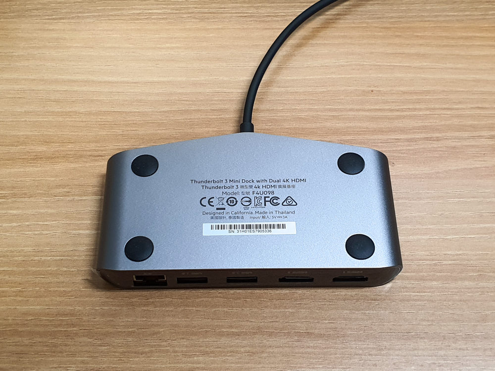 벨킨 썬더볼트 3 독 미니는 위 이미지와 같이 2개의 4K 해상도에 60Hz 주사율을 지원하는 HDMI 포트 두 개와 USB 3.0 규격을 지원하는 USB-A 포트 하나, USB 2.0 규격을 지원하는 USB-A 포트 하나, 1Gbps 속도를 지원하는 RJ45 포트 한 개의 포트로 구성되어 있습니다. 듀얼 모니터를 사용하는 저에겐 딱 괜찮은 포트 조합이라고 생각되고, 가격도 다른 썬더볼트 3 독 제품들과 비교하여 합리적인 가격이라고 생각되어 구매하게 되었습니다.
